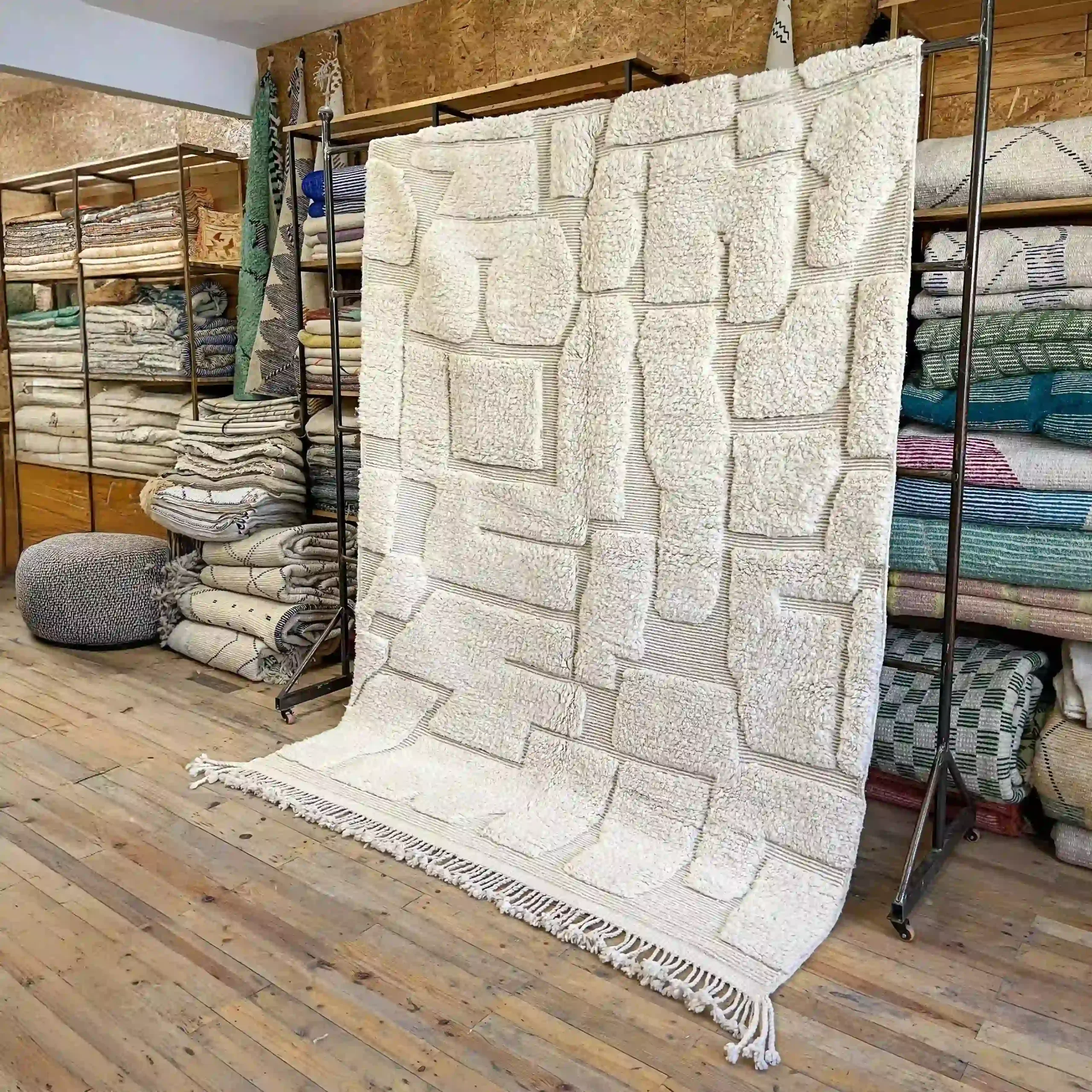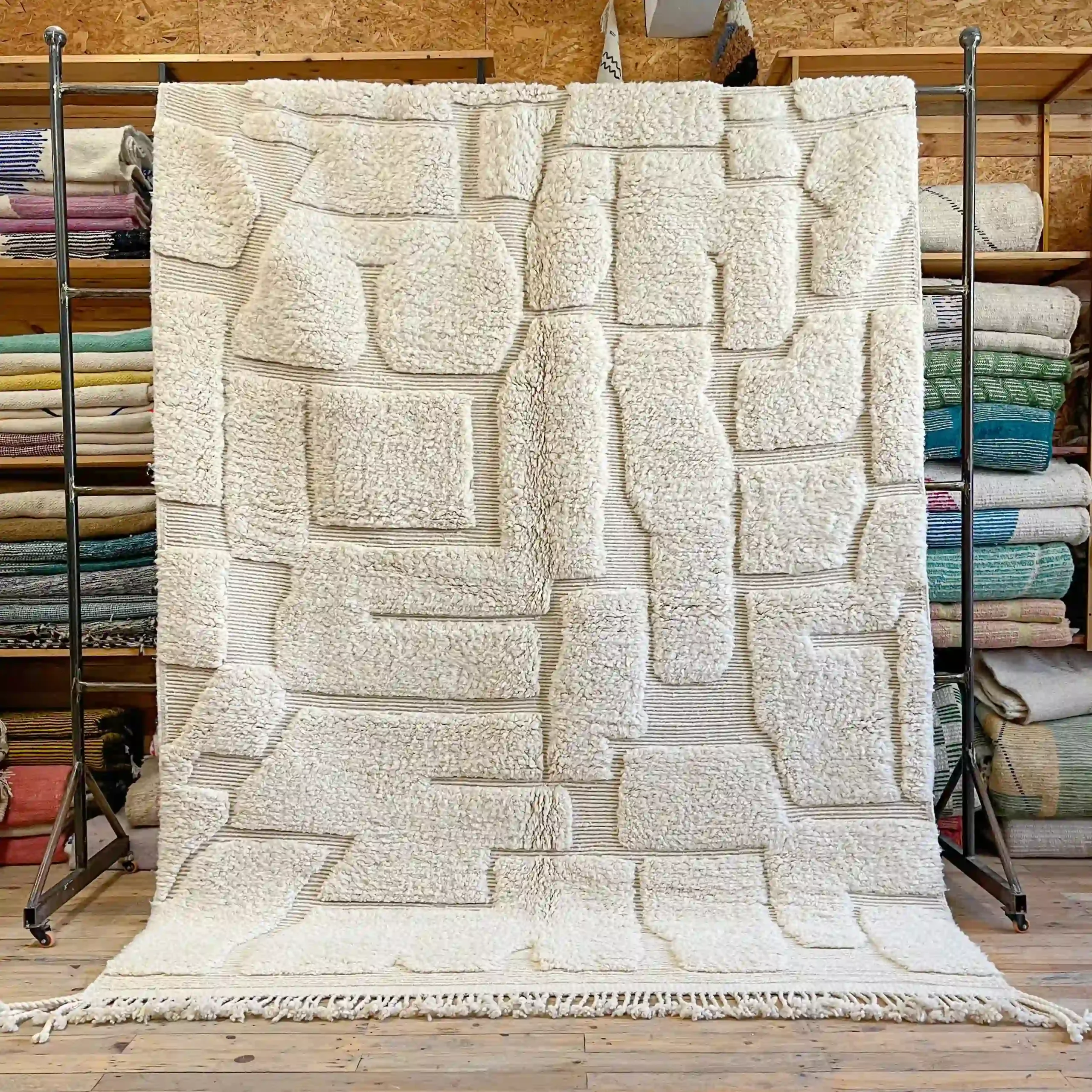 Illuminate your space with the captivating charm of Moroccan heritage with our Beni Ouarain Bright Light White Geometric Rug. Handcrafted by skilled artisans, each rug features intricate geometric patterns in a radiant bright light white hue. Made from premium materials, this rug adds a touch of elegance and sophistication to any room, showcasing the timeless beauty of Moroccan craftsmanship.